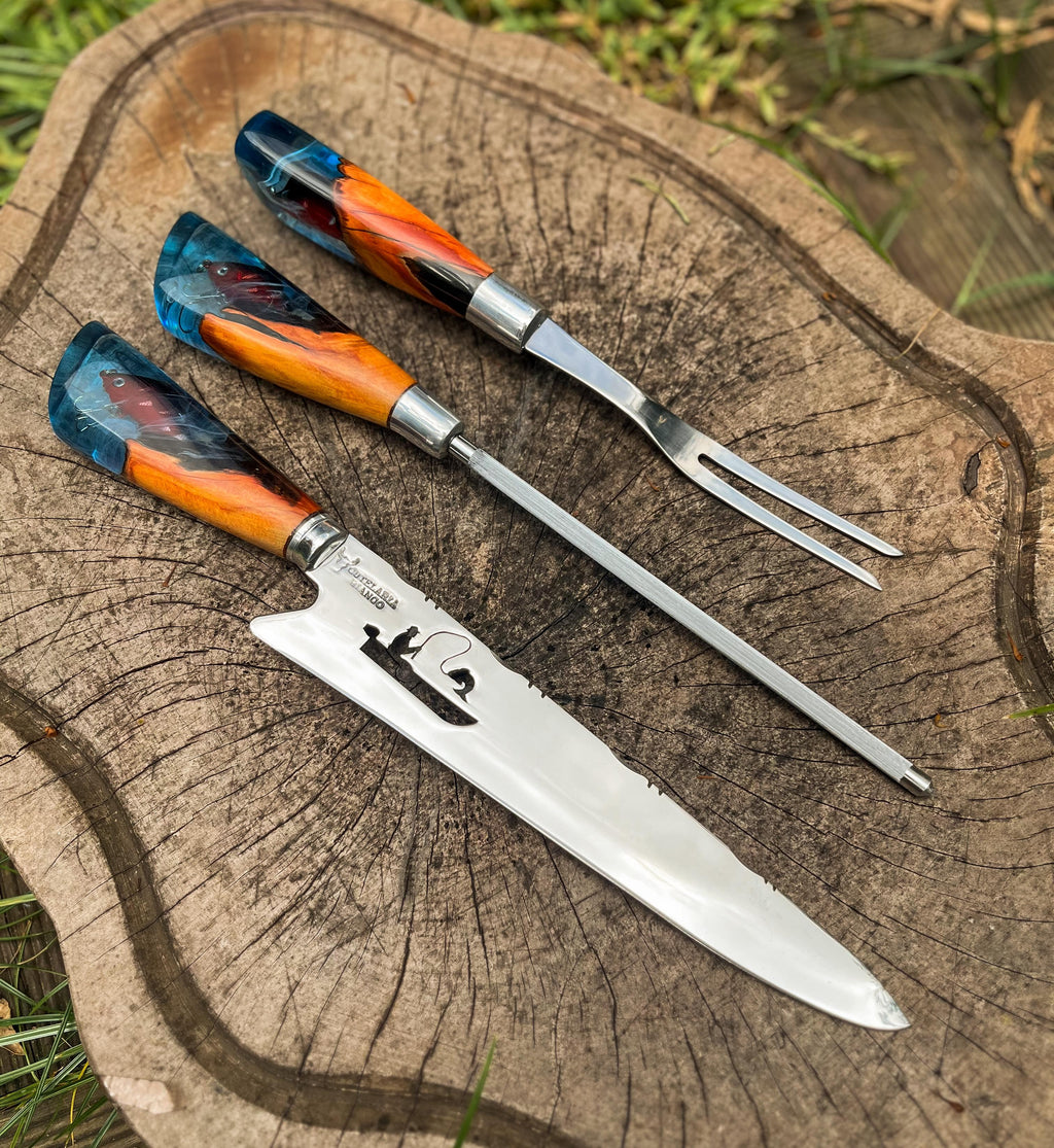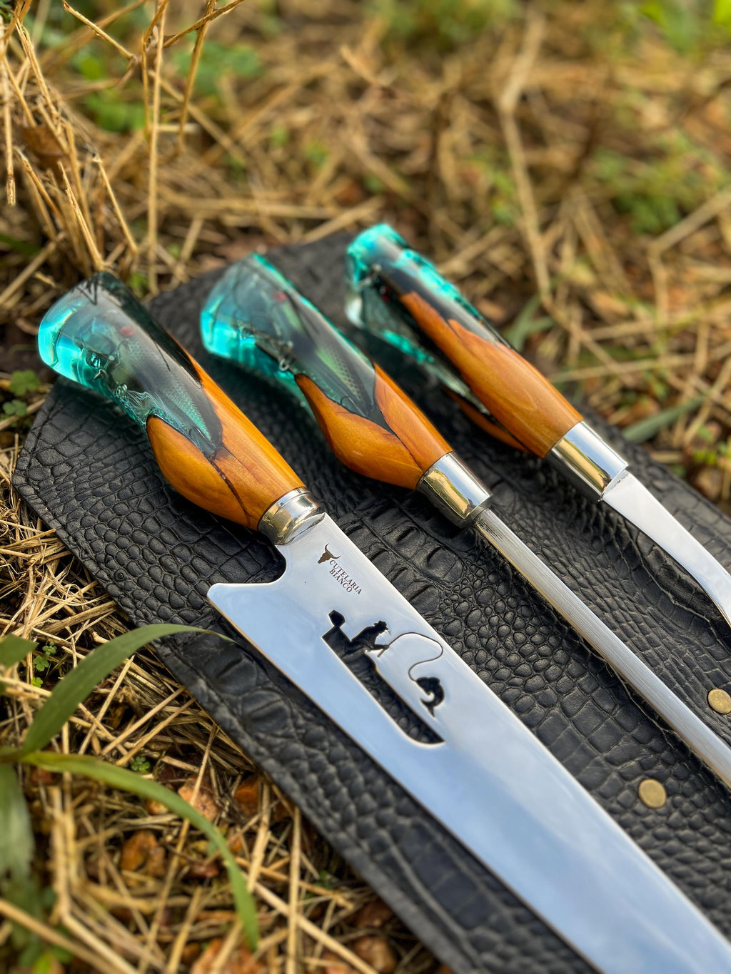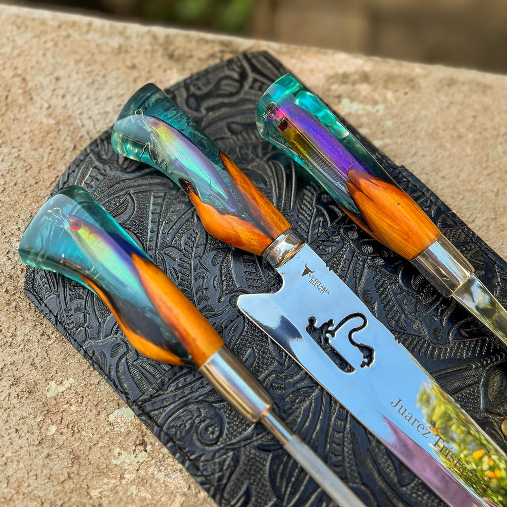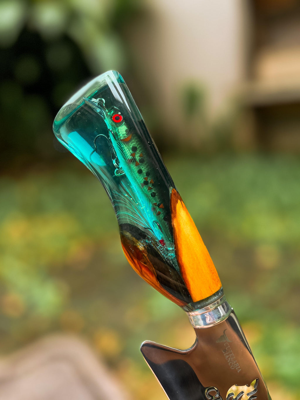 Um verdadeiro destaque desta faca é seu cabo, uma obra-prima que combina madeira de alta qualidade com cristal líquido importado, adornado por um pingente (isca artificial) inspirado no mundo da pesca.