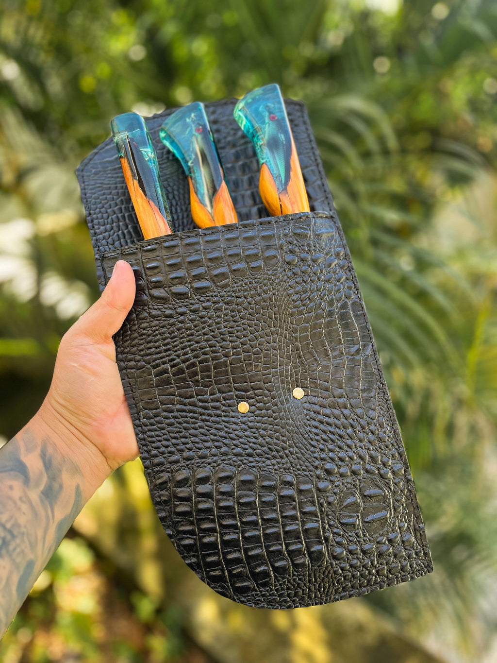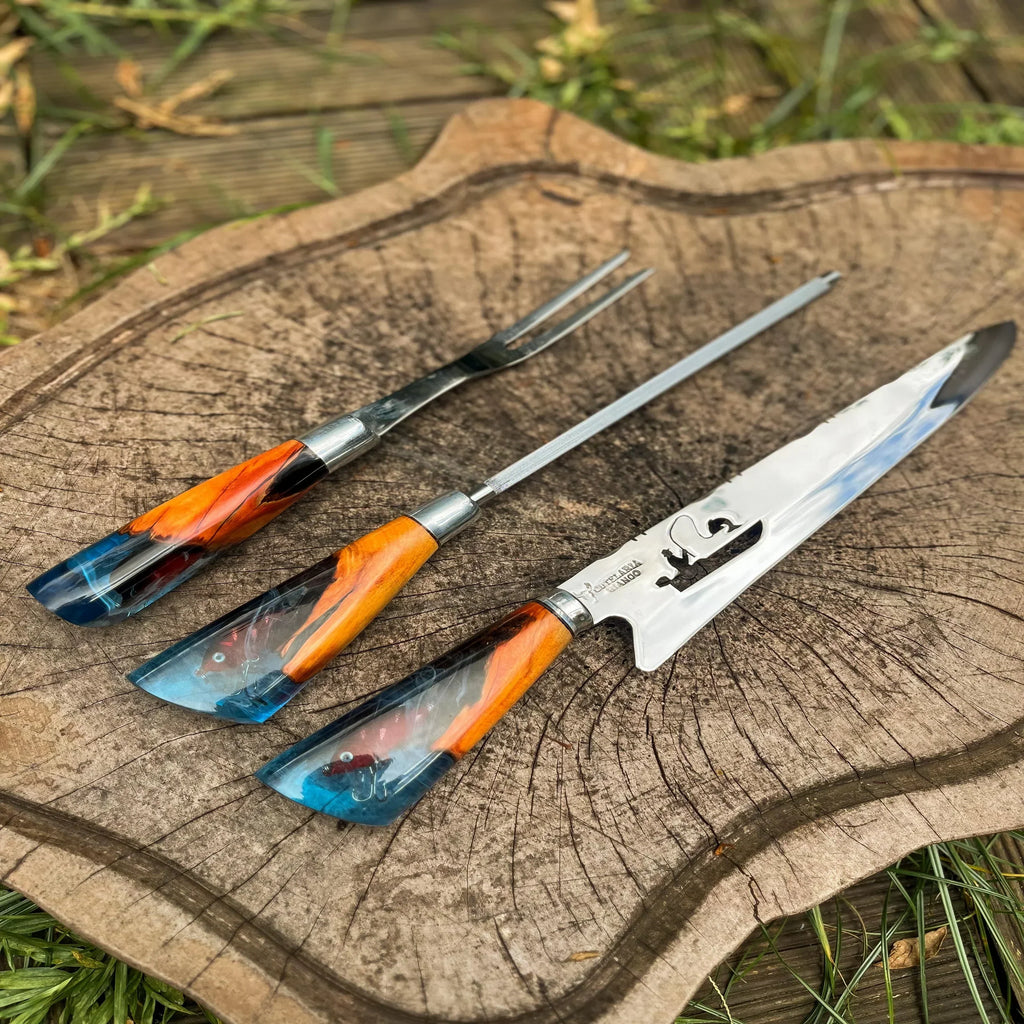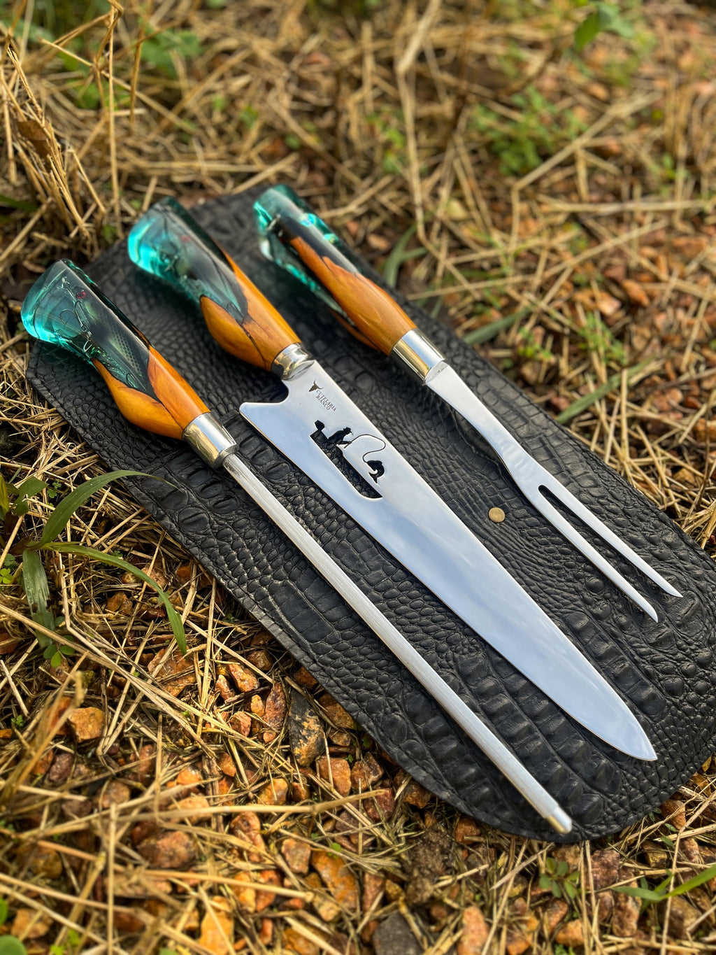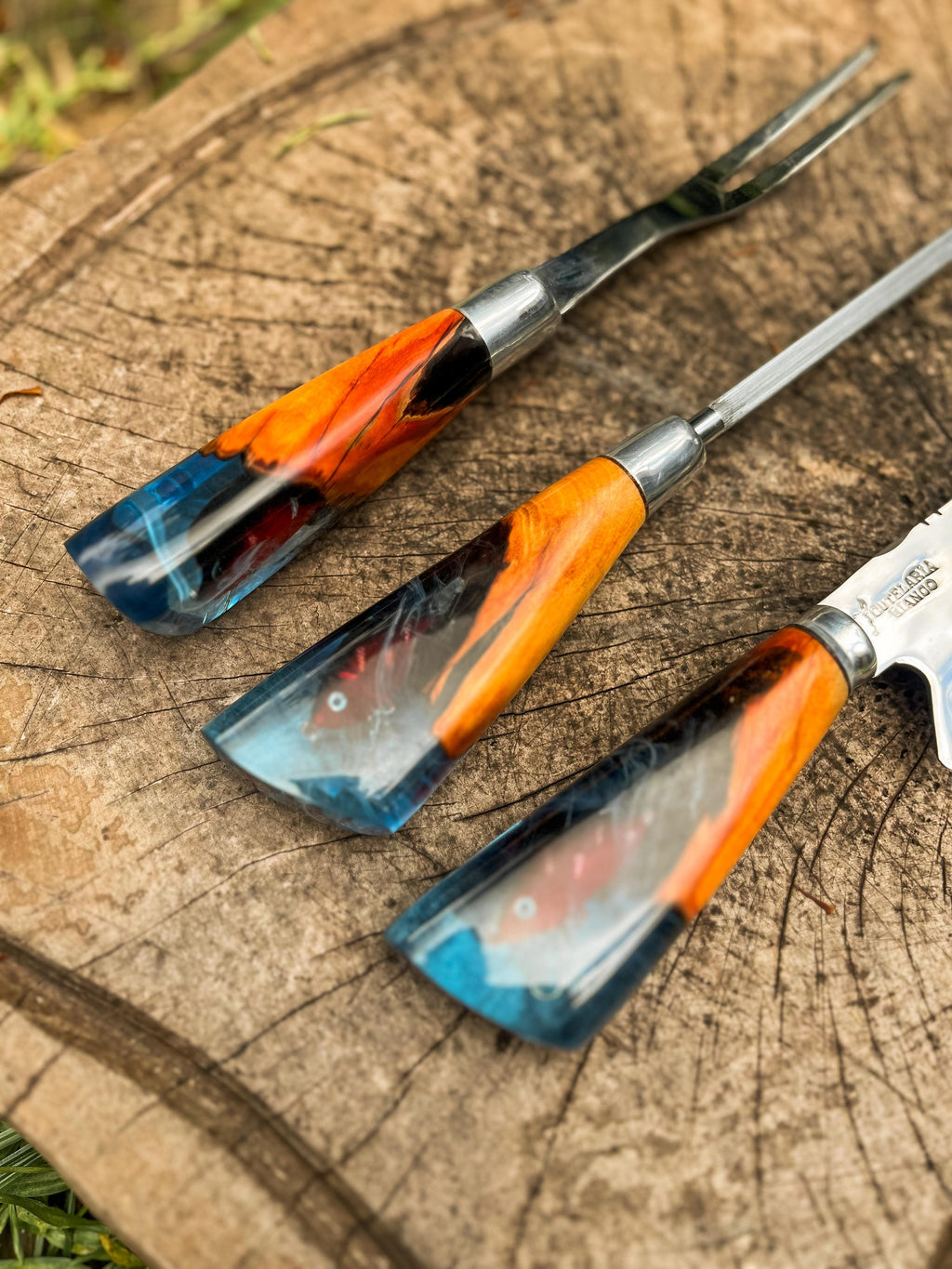 Um verdadeiro destaque desta faca é seu cabo, uma obra-prima que combina madeira de alta qualidade com cristal líquido importado, adornado por um pingente (isca artificial) inspirado no mundo da pesca.